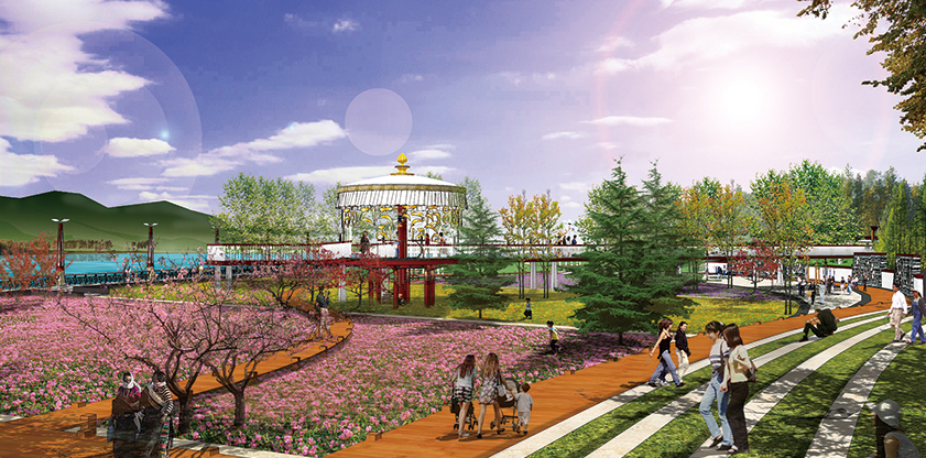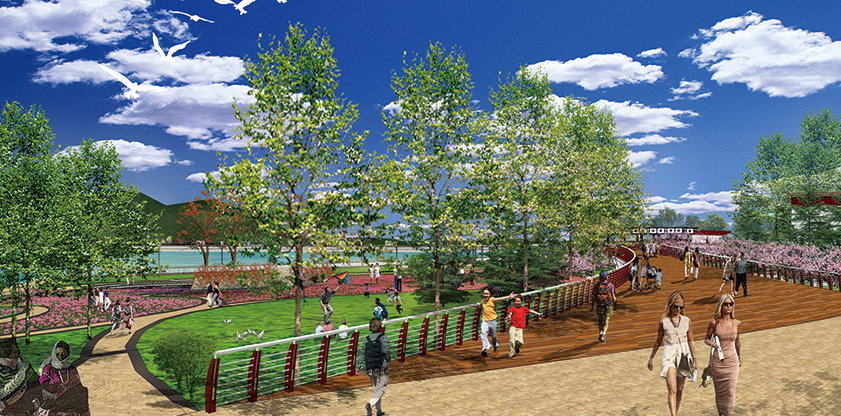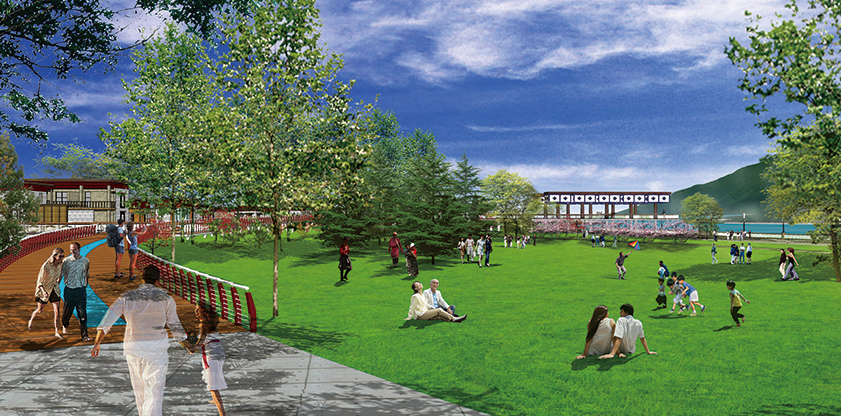 拉薩河景觀建設(shè)用地東起納金大橋,西至新拉貢公路大橋,位于拉薩河城區(qū)段百年大堤與子堤之間,總長度約20公里,總面積約400公頃。拉薩河景觀設(shè)計依據(jù)拉薩市總體規(guī)劃,遵循現(xiàn)有城市肌理,結(jié)合地形地貌,旨在將拉薩河打造為“多彩的哈達(dá),綠色的玉帶”,與布達(dá)拉宮遙相呼應(yīng),成為“高原明珠,雪域圣地”拉薩的綠色自然景觀。具有藏族特色的景點(diǎn)猶如五彩斑斕的寶石,散落在玉帶之中,科學(xué)有序的道路規(guī)劃將景點(diǎn)串聯(lián)起來,傳統(tǒng)文化與綠色在這里融合,不僅展示傳統(tǒng)藏區(qū)的風(fēng)貌,也體現(xiàn)未來高原圣地的綠色生態(tài)特色。