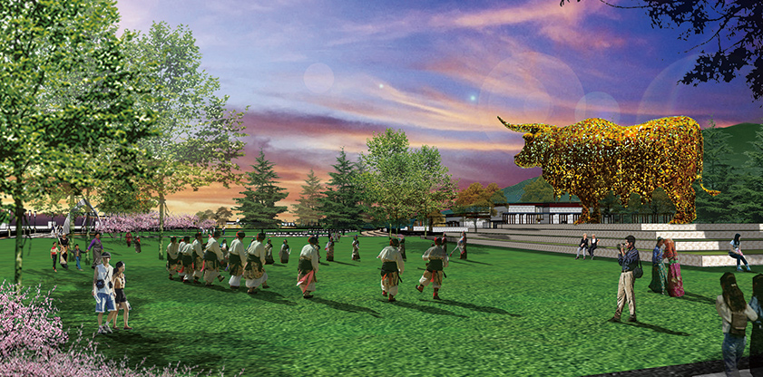 “圣地福谷”與雪域瓊島隔水相望,共同位于以布達(dá)拉宮為中心的拉薩景觀軸線上,佛光普照、神圣祥和。該地塊與南部次角林文化旅游度假區(qū)相連,是文化旅游產(chǎn)業(yè)向水邊的延伸,在區(qū)域內(nèi)引入水系,形成內(nèi)湖,湖心設(shè)置大型的格薩爾王雕塑廣場,利用其周邊場地和水面,開展文化演出活動。并設(shè)計內(nèi)外聯(lián)動的文化長廊,配合文化展示和民俗傳統(tǒng)展示。